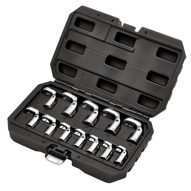 This flexible crowfoot socket wrench set is ideal for hard-to-reach areas, providing up to 110 access. Made from high-quality chrome vanadium steel for durability and strength. Satin chrome finish for corrosion protection. Suitable for all hydraulic, fuel, oil brake, A/C, O2 sensor and air line work. Sizes 8-19mm. Supplied inside a blow moulded plastic storage case.