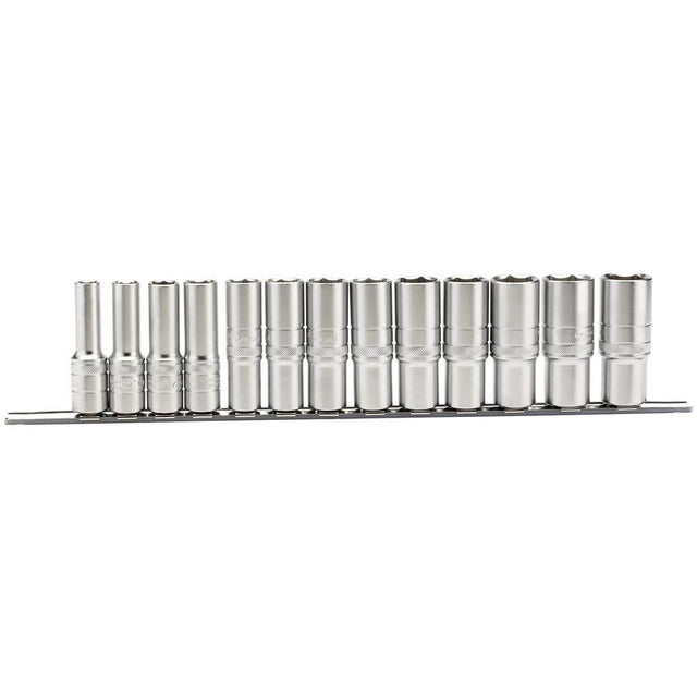 Expert Quality, manufactured from chrome vanadium steel hardened and tempered with a micro satin finish. Each socket has a knurled ring for extra grip. Supplied on a metal socket rail for secure storage.