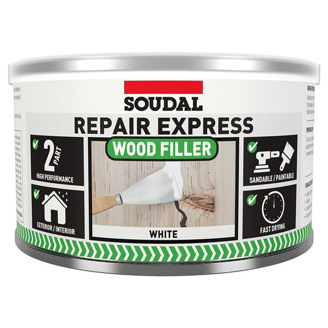 High performance 2 part wood filler. Polyester based. Full cure in circa 30 minutes.