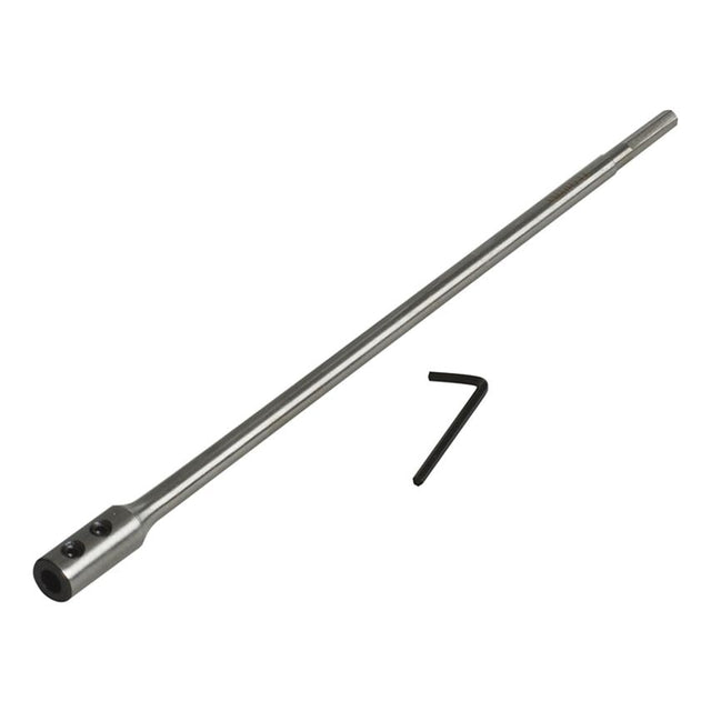 The Faithfull 300mm extension complete with hexagonal locking key. Used with flat bits of between 16mm to 35mm it allows bits to bore deep or longer length holes through thick timber. Can be used with all makes of flat bit featuring a 1/4in hex shank.