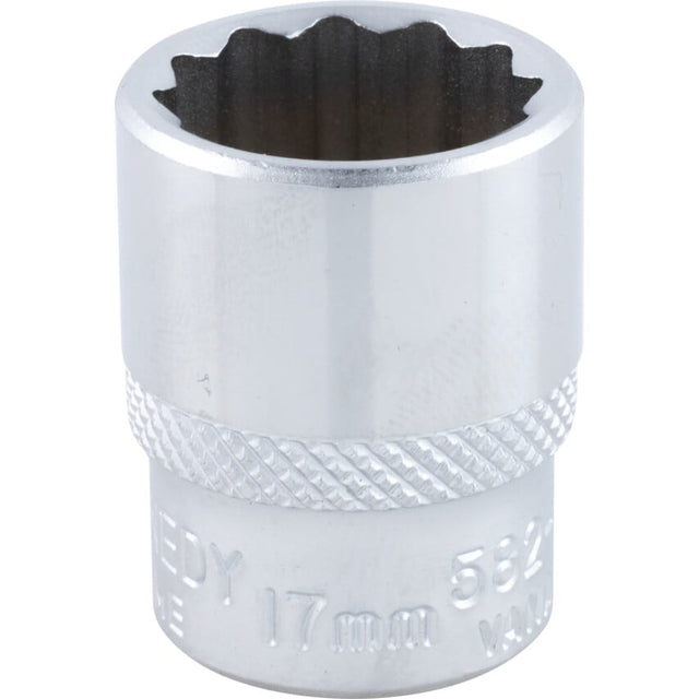 Available in metric sizes, these 3/8" square drive, bi-hexagonal sockets are ideal for applications in which high torque is required. With a 12 point system and side drive design, each socket gives a higher torque than normal sockets, can grip worn nuts and will not round off existing nuts. Every socket possesses a ball-retaining groove on each face of the square drive and requires only a one-twelfth turn to engage the next point of the socket. Constructed from chrome vanadium steel with a highly polished, chrome plated, mirror finish.
