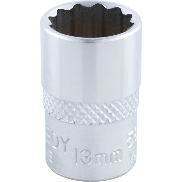 Available in metric sizes, these 3/8" square drive, bi-hexagonal sockets are ideal for applications in which high torque is required. With a 12 point system and side drive design, each socket gives a higher torque than normal sockets, can grip worn nuts and will not round off existing nuts. Every socket possesses a ball-retaining groove on each face of the square drive and requires only a one-twelfth turn to engage the next point of the socket. Constructed from chrome vanadium steel with a highly polished, chrome plated, mirror finish.