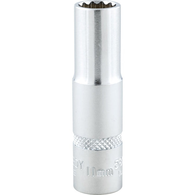 Available in a range of metric sizes, these 3/8" square drive, bi-hexagon deep sockets offer superior torque with minimal user exertion. Manufactured from chrome vanadium steel and complete with a chrome-plated, polished mirror finish. With a 12 point side and side drive, the deep socket gives a higher torque than normal sockets, grips worn nuts and will not round off existing nuts. Each socket possesses a ball-retaining groove on each face of the square drive, which ensures a positive fit with accessories. Requires only a one-twelfth turn to engage the next point of the socket.
