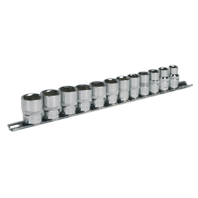 Chrome Vanadium steel sockets, hardened and tempered for added strength. Fully polished chrome finish for corrosion resistance. WallDrive configuration giving an additional 30% more torque handling power than traditional sockets. Knurled ring for extra grip with oily fingers. Supplied with socket rail.