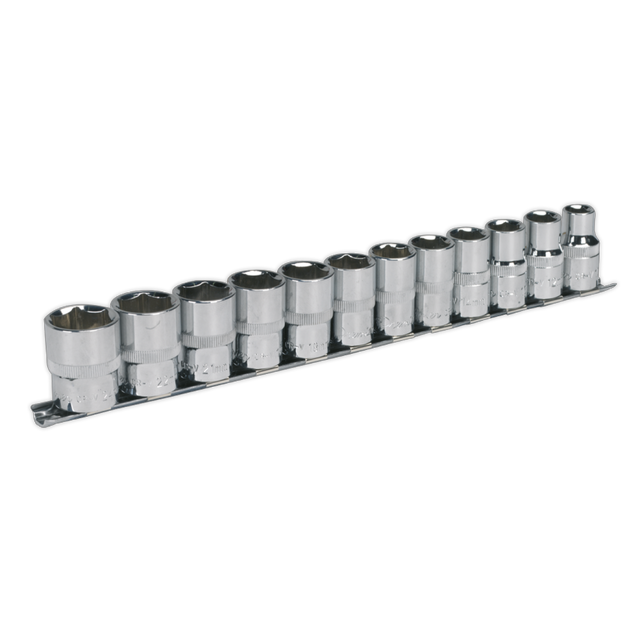 Chrome Vanadium steel sockets, hardened and tempered for added strength. Fully polished chrome finish for corrosion resistance. WallDrive configuration giving an additional 30% more torque handling power than traditional sockets. Knurled ring for extra grip with oily fingers. Supplied with socket rail.