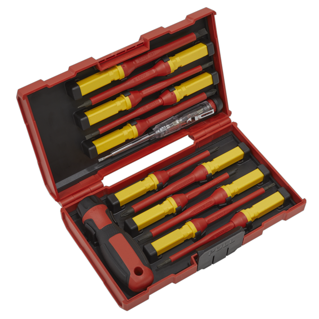 Hardened and tempered Chrome Vanadium steel shafts. Magnetized tips with a phosphate finish for resistance to corrosion. Impact resistant handle with a contoured, comfortable grip and twist release mechanism. Interchangeable blades lock securely within the handle. Insulated and VDE approved for use up to 1000V AC and 1500V DC. Includes mains tester. Supplied in storage case.