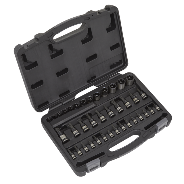 Drop-forged Chrome Vanadium steel sockets with S2 steel TRX-Star* bits. Sockets heat treated and chrome plated for resistance to corrosion. Fully polished black chrome finish with machined and lacquered surface. Knurled ring to assist gripping with oily fingers. Supplied in storage case.