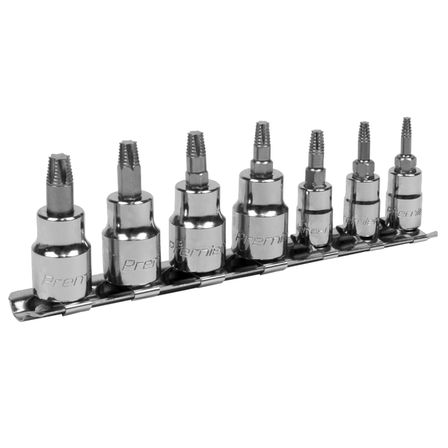 Professional heat treated Chrome Vanadium steel sockets. S2 Steel bits with a satin chrome finish. Designed for extracting TRX-Star* screw heads and fasteners that have become damaged, cross-threaded or jammed. Supplied on a metal socket rail.