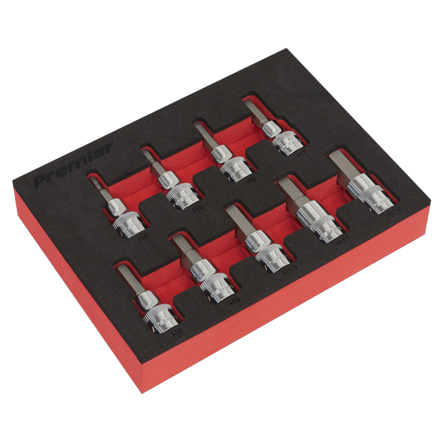 Forged Chrome Vanadium steel sockets with S2 steel hex bits. Sockets are heat treated and chrome plated with a fully polished mirror finish. Knurled rings assist the gripping of the sockets with oily fingers. Supplied in EVA tray.