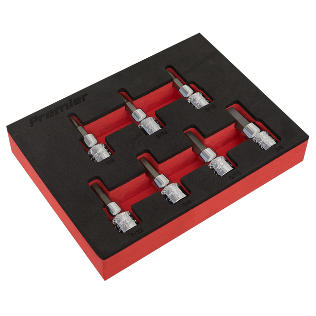 Forged Chrome Vanadium steel sockets with S2 steel hex bits. Sockets are heat treated and chrome plated with a fully polished mirror finish. Knurled rings assist the gripping of the sockets with oily fingers. Supplied in EVA tray.