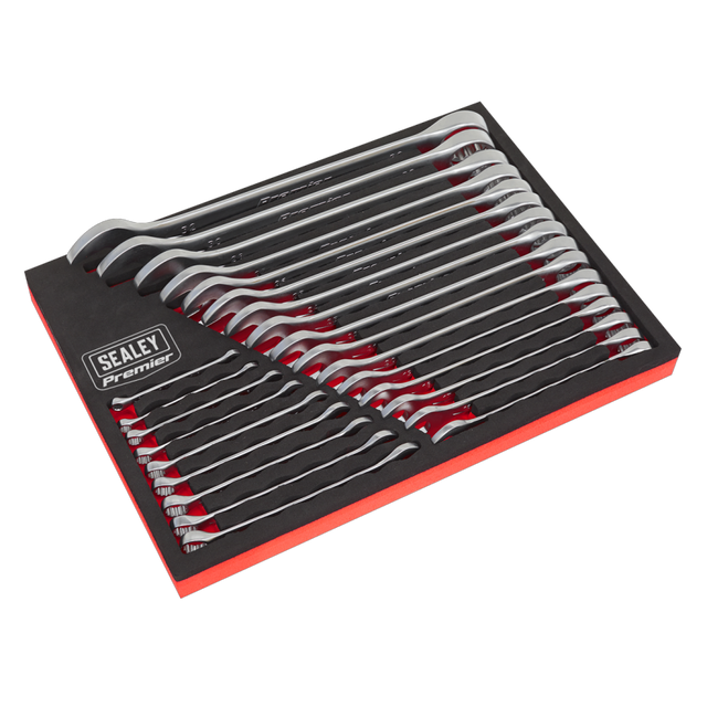 Slim style Chrome Vanadium steel spanners with a satin polished finish for corrosion resistance. Open end and 12-point WallDrive ring combination. Supplied in EVA storage tray.