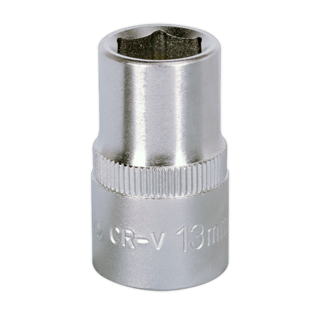 Cold-forged Chrome Vanadium steel socket. Hardened and tempered for added strength. Chrome plated in half chrome, half satin finish with knurled ring for extra grip with oily fingers. WallDrive socket configuration.