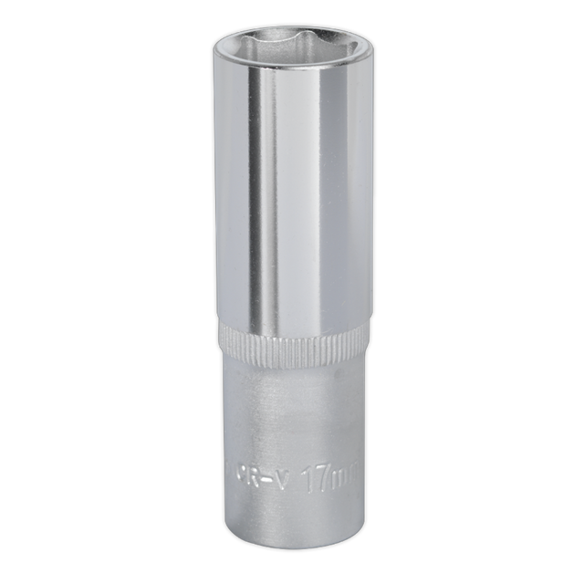 Cold-forged Chrome Vanadium steel socket. Hardened and tempered for added strength. Chrome plated in half chrome, half satin finish with knurled ring for extra grip with oily fingers. WallDrive socket configuration.