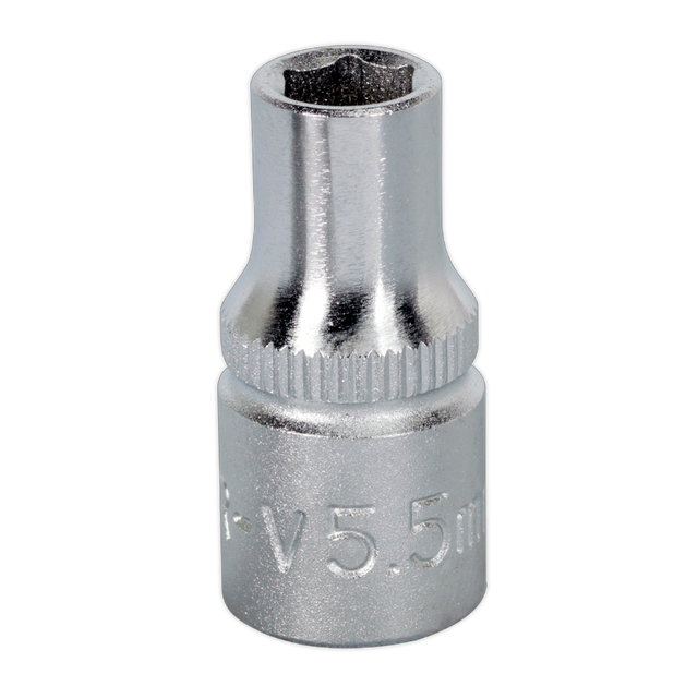 Cold-forged Chrome Vanadium steel socket. Hardened and tempered for added strength. Chrome plated in half chrome, half satin finish with knurled ring for extra grip with oily fingers. WallDrive socket configuration.