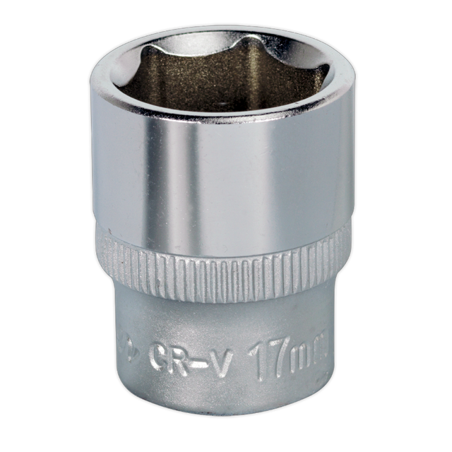Cold-forged Chrome Vanadium steel socket. Hardened and tempered for added strength. Chrome plated in half chrome, half satin finish with knurled ring for extra grip with oily fingers. WallDrive socket configuration.