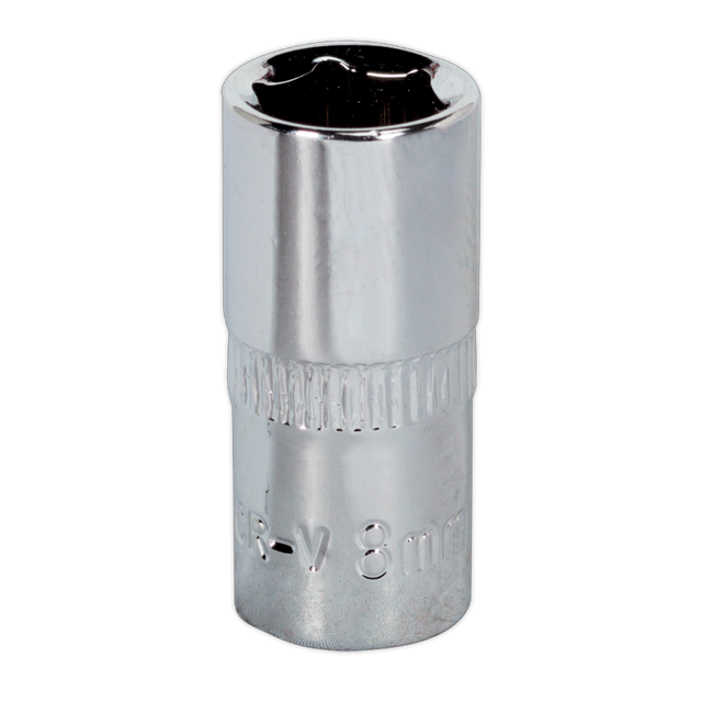 Cold-forged Chrome Vanadium steel socket. Hardened and tempered for added strength. Chrome plated with a fully polished mirror finish. WallDrive socket configuration. Knurled ring for extra grip with oily fingers.