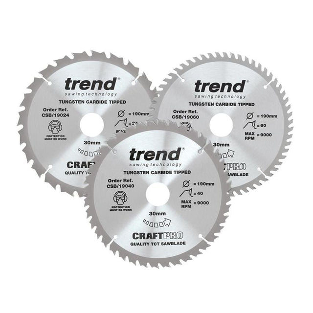 This Trend CraftPro Saw Blade Triple Pack contains a range of same diameter saw blades, designed for a professional finish in softwood, hardwood, plasterboard, stone fibreboard, particle board, veneer, plywood, MDF and hardboard. Microgranular Tungsten Carbide tipped to allow for cutting of abrasive materials. Silver brazed to ensure tips are securely bonded to body. With a reamed bore to ensure a precise spindle fit. Laser etched on reverse to European standard EN 847-1/2. Contains 1 x CSB/19024 Combination Cut Saw Blade for Hand Held Saws 190 x 30mm x 24T 1 x CSB/19040 General-Purpose Saw Blade for Hand Held Saws 190 x 30mm x 40T 1 x CSB/19060 Saw Blade for Hand Held Saws 190 x 30mm x 60T