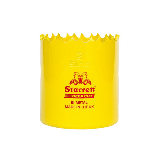 The Starrett Deep Cut Bi-Metal Holesaws offer aggressive material penetration and kerf clearance. Improved tooth material for enhanced heat and wear resistance and greater product life. Ideal for solid materials or tubes with a wall thickness greater than 3mm. The large cutting depth improves cutting performance on tubes, particularly where there is a need to cut through both sides of the tube. Cutting Depth: 51mm.