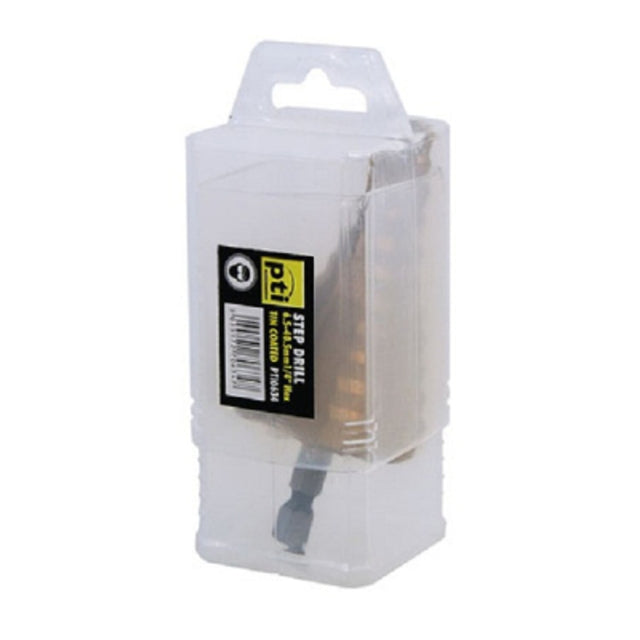 The PTI HSS Tin Coated Step Drill 6.5 - 40.5mm is designed for precision drilling in a range of sizes within its diameter range. Ideal for working with thin materials, this step drill allows for progressive hole sizes with a smooth, chamfered finish. Size Range : 6.5 - 40.5mm, with increments: 6.5, 8.5, 10.5, 12.5, 16.5, 20.5, 25.5, 29, 32.5, 36.5, 40.5mm Material : High-speed steel (HSS), Tin coated Features : Self-starting with multiple hole sizes Provides a smooth, chamfered edge Ideal for drilling thin, rigid materials Brand : PTI