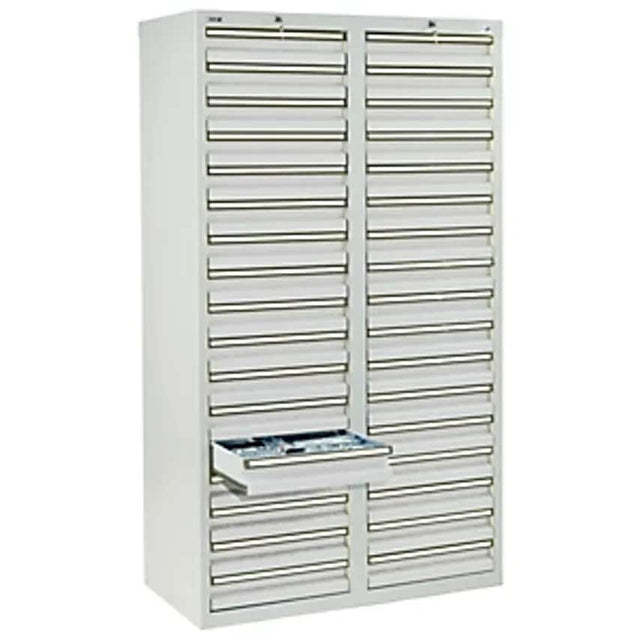 Drawer cupboard, HxWxD 1800 x 1000 x 500 mm, 34 drawers 100 mm high, grey body and drawers. Supplied = assembled. Height = 1800 mm. Width = 1000 mm. Depth = 500 mm. Max. drawer load = 35 kg. Number of drawers = 34 pcs. Drawer height = 34x100 mm. Drawer extension = 80%. Body colour = light grey RAL 7035. Front colour = light grey RAL 7035. Fittings = individual pull-out stop. Material = sheet steel. Drawer guide = roller guide. Lock type = central locking with cylinder lock. Internal drawer dimensions = 400x460x84 mm. Feature = can be labelled. With ball bearing mounted telescopic guides. Easy sliding, convenient drawers. Various combinations available. Sturdy, durable construction made of quality sheet steel. Central locking with cylinder lock. Your advantage Individual pull-out stops and roller guides for more safety and comfort.