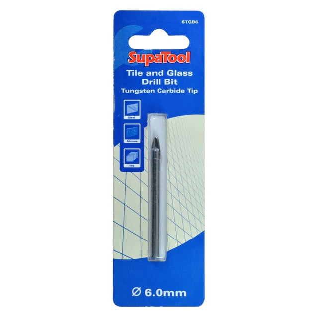 SupaTool Glass Drill Bit 6mm Spear point drill bit with precision diamond ground tip For exact pilot drilling into glass, tiles and porcelain Flute less straight shank with high quality tungsten carbide tip Tungsten Carbide Tip - Drills: Glass, Mirrors, Tile Due to geographical locations we are unable to deliver to: Isle of Wight, Isle of Man and Ireland.