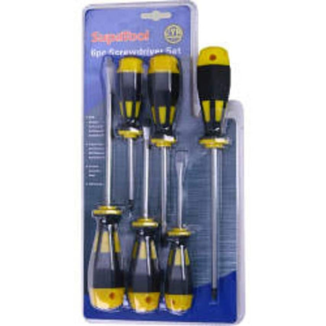 SupaTool Screwdriver Set 6 Piece Slotted Head: 5mm x 3" (75mm) , 6mm x 4" (100mm) , 6mm x 6" (150mm) Cross Head: PH1 x 3" (75mm) , PH2 x 4" (100mm) , PH2 x 6 (150mm) Chrome vanadium steel Soft grip handle 3 slotted head 3 cross head 2 Year Guarantee Due to geographical locations we are unable to deliver to: Isle of Wight, Isle of Man and Ireland.