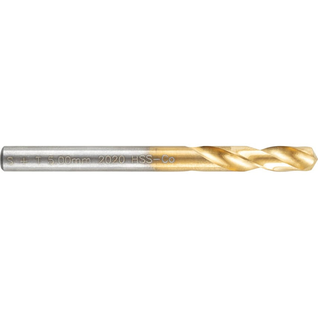 Series 2020 HSS-Co Straight Shank Heavy Duty Stub Drills Metric Heavy duty drill made of cobalt material with excellent heat resistance. For drilling steels up to 1,400N/mm2, stainless steel, heat resistant steels and bronze. Ideally suited for volume production on automatics. TiN coating provides longer tool life or increased cutting speeds. Point angle: 135, helix angle: normal, web thickness: strengthened, tolerance of diameter: h8, tolerance of shank: f11. Manufactured to BS 328, DIN 1897RN. Point to DIN 1412C.