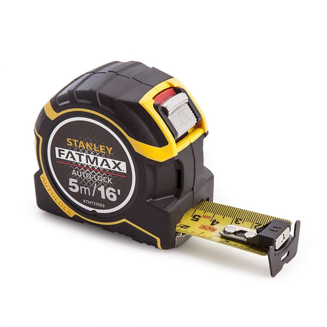 Stanley XTHT0-33503 Fatmax Autolock Tape with increased blade life The Stanley XTHT0-33503 FatMax Pro Autolock 5m/16ft Tape has a patented reverse lock mechanism for greater control and increased blade life. The Mylar coated blade is up to 10 times more resistant to abrasion than normal lacquered blades and it has BladeArmor coating on the first 80mm for double the blade life. It has a 3m blade standout for increased reach and easier measuring and the detachable hook allows the user to work efficiently in different conditions. It has a bi-material case for increased user comfort and is fitted with a secure hook for handy belt storage. Features: Detachable hook Mylar coated blade Secure hook for belt storage Patented reverse lock mechanism Specification: Length: 5m/16ft Blade Width: 32mm