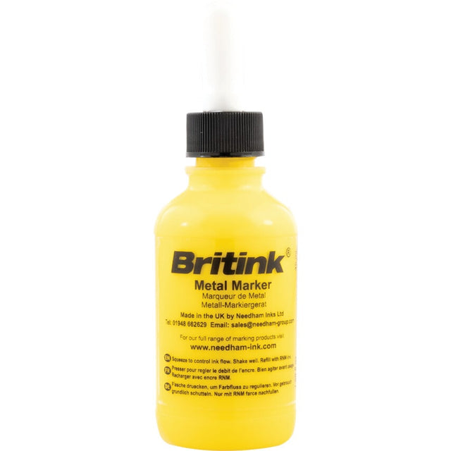 Permanent bright opaque markers for most surfaces, whether semi-porous or non-porous. RNM ink penetrates grease, oil and rust to give a waterproof mark which will withstand many kinds of metal processing. The marker comprises a flexible plastic container with a ball valve writing head. Features and Benefits Permanent bright and opaque ink RNM ink penetrates grease oil and rust for a waterproof mark Withstands metal processing for easy identification Ball valve head for controlled ink flow Typical Applications Metals Rigid plastics Painted surfaces Wood Stone Asphalt Notes Complete with standard 2.5mm ball heads Size: 45ml Please note, colours are for guidance only