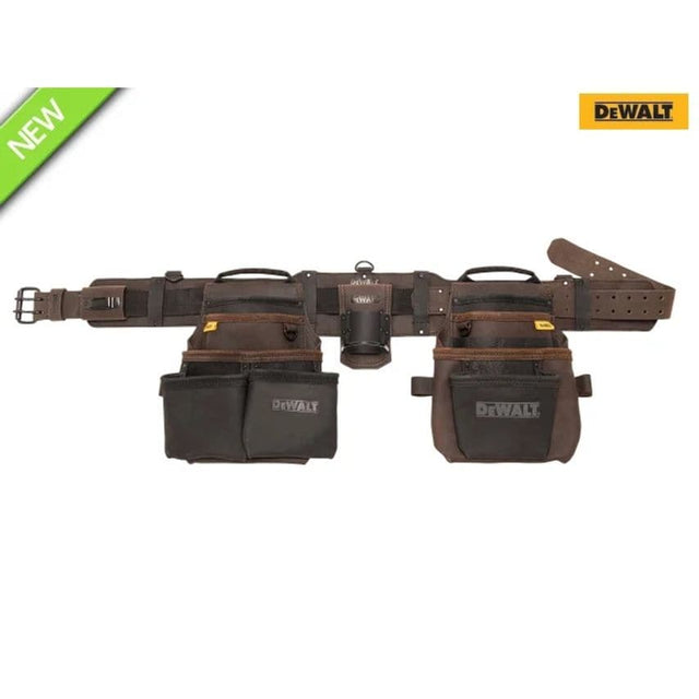 DEWALT DWST50113 Pro Leather Tool Rig with various pockets, tape measure pocket, external screwdriver holders and metal hammer loop. Made from premium nubuck top grain leather. Riveted at stress points for increased durability. The heavy-duty, ergonomic webbing leather belt is padded for extra comfort. Dual belt eyelets and a metal roller buckle provide an enhanced hold. There are also two top carry handles so you can easily transport the belt when not in use. Specification: Belt Size: 142cm. Technical Specs Belt Size: 142cm.