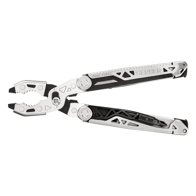 TheGerber Dual Force Multi Toolhas a layered construction to provide 3x the jaw strength and 2x the force to manhandle any task put in front of it.It features 13 tools:small fastener pliers, regular pliers, adjustable, two-size slip joint jaw, wire cutter, wire stripper, 3.25in plain edge blade, 3.35in center-drive axis tech, saw, fine/coarse file, chisel edge, #1 and #2 cross drive, medium flathead driver, 8in/20cm ruler and lanyard hole.The adjustable 2-position slip joint jaw and extra-large teeth grasp firmly onto a variety of fasteners and apply unparalleled control.Specifications:Closed Length: 118mm.Blade Length: 8.2/8.5cm.Weight: 340g.