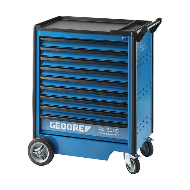 Body: Dimensions: H 812 x W 771 x D 478 mm Working platform in ABS, with 3 compartments for small parts With handle for easy pushing, pulling and turning Side walls with Euro perforation 10 x 38 mm to fix hooks and tools Heel and impact protection for your safety Sheet steel, corrosion resistant and scratch-proof powder-coated, GEDORE blue Drawers: Central locking with cylinder lock Wide drawers (W 640 x D 400 mm) fully extendable, removable Each drawer with safety locking, single-hand operation Ball-bearing guide rails Can be individually equipped with lengthwise and crosswise dividers (can be ordered individually) Load capacity per drawer 40 kg, bottom heavy-duty drawer 60 kg Sheet steel, corrosion resistant and scratch-proof powder-coated, GEDORE blue GEDORE High-performance chassis: Total load capacity 1000 kg static (750 kg dynamic) 2 high-performance wheels on roller bearings (fixed castors 200 mm) 2 smooth running wheels on ball bearings (swivel castors 125 mm), both with total brake The GEDORE trapezoidal axle construction secures smooth running, manoeuvrability and track-keeping also in case of maximum loads Accessories: Length- (LT) and crosswise (QT) dividers from zinc-plated sheet steel (can be ordered individually) Options: Can be equipped with GEDORE tool modules (1500 ES/1500 CT or 2005 CT) Optionally extendable with GEDORE tool chests, rear panels and tool holders Further drawer combinations on request Special colours and designs available on request Delivery without tools and accessories