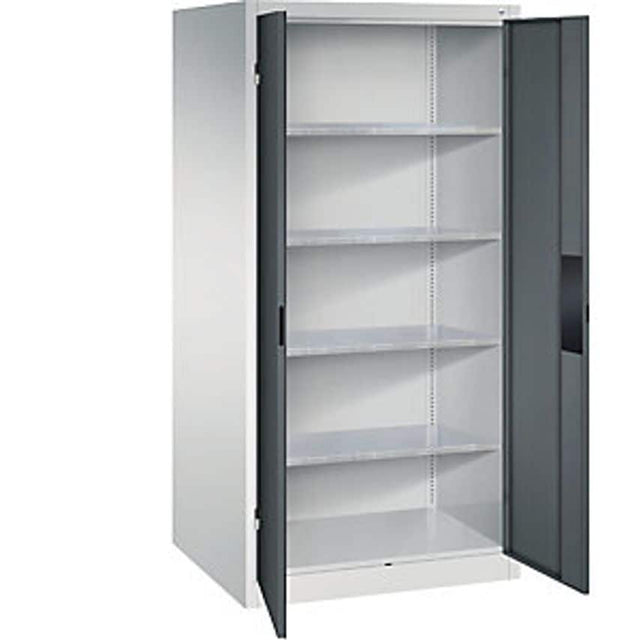 Heavy duty workshop cupboard, width 930 mm, depth 800 mm, charcoal door. Supplied = assembled. Height = 1950 mm. Width = 930 mm. Depth = 800 mm. Internal width = 928 mm. Internal height = 1840 mm. Internal depth = 753 mm. Plinth height = 100 mm. Design = welded. Max. cupboard load = 700 kg. Housing material = steel. Door material = steel. Finish = stove enamelled. Shelf material = steel, zinc plated. Body colour = light grey RAL 7035. Door colour = charcoal RAL 7016. Max. shelf load = 110 kg. Number of shelves = 4 pcs. Shelf height adjustment increments = 15 mm. Door type = hinged door. Opening angle of doors = 180 . The standard width for universal use in the workshop, warehouse and factory. High max. load of each zinc plated shelf: 110 kg. Max. cupboard load 700 kg. Door opening angle approx. 180. Patented, user-friendly Ergo-Lock 4.0 handle lock incl. 2 keys. Zinc plated shelves, height adjustable in 15 mm increments. Particularly sturdy and hardwearing workshop cabinets for demanding everyday industrial use. Welded, powder coated sheet steel construction. Body light grey RAL 7035. The zinc plated shelves are resistant to mechanical stress and can carry a max. load of up to 110 kg. Optimum versatility due to option of adjustment in 15 mm increments. The max. bay load of the cabinet is 700 kg. Cabinet height 1950 mm (internal height 1840 mm) Ergo-Lock 4.0 handle lock: Improved operating safety, resistance to wear, and appearance due to the handle lock (3 bolt lock) in black with 2 keys - to close the door, the recessed handle only needs to be pressed shut. Over 150 colour combinations available at no extra charge
