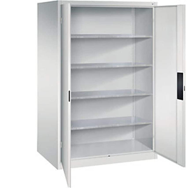 Heavy duty workshop cupboard, width 1200 mm, depth 800 mm, light grey door. Supplied = assembled. Height = 1950 mm. Width = 1200 mm. Depth = 800 mm. Internal width = 928 mm. Internal height = 1840 mm. Internal depth = 753 mm. Plinth height = 100 mm. Design = welded. Max. cupboard load = 700 kg. Housing material = steel. Door material = steel. Finish = stove enamelled. Shelf material = steel, zinc plated. Body colour = light grey RAL 7035. Door colour = light grey RAL 7035. Max. shelf load = 110 kg. Number of shelves = 4 pcs. Shelf height adjustment increments = 15 mm. Door type = hinged door. Opening angle of doors = 180 . Wide, large cabinets - suitable for storing large and bulky goods. High max. load of each zinc plated shelf: 110 kg. Max. cupboard load 700 kg. Door opening angle approx. 180. Patented, user-friendly Ergo-Lock 4.0 handle lock incl. 2 keys. Zinc plated shelves, height adjustable in 15 mm increments. Particularly sturdy and hardwearing workshop cabinets for demanding everyday industrial use. Welded, powder coated sheet steel construction. Body light grey RAL 7035. The zinc plated shelves are resistant to mechanical stress and can carry a max. load of up to 110 kg. Optimum versatility due to option of adjustment in 15 mm increments. The max. bay load of the cabinet is 700 kg. Cabinet height 1950 mm (internal height 1840 mm) Ergo-Lock 4.0 handle lock: Improved operating safety, resistance to wear, and appearance due to the handle lock (3 bolt lock) in black with 2 keys - to close the door, the recessed handle only needs to be pressed shut. Over 150 colour combinations available at no extra charge