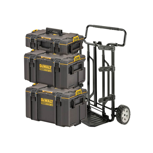 The DEWALT TOUGHSYSTEM 2.0 Toolboxes feature a high-performance seal in the lid, this ensures they are dust-tight and waterjet resistant (IP65) to withstand the most severe weather. With easy close, metal wire front latches for easy one-handed operation. A metal-reinforced padlock eye provides increased security.Fitted with strong, ergonomic handles for more comfortable transportation. Auto Stacking Latches are intuitive and easy to use, allowing TOUGHSYSTEM modules to be connected together. These newer style latches are compatible with older TOUGHSYSTEM modules.DEWALT Tracker compatible, an internal fixing point allows the DEWALT Tracker to be installed and the box tracked via the DEWALT Tool Connect App. There is also a handy name panel insert, this allows boxes to be labelled for easy identification.This DEWALT TOUGHSYSTEM 2.0 Toolbox Kit contains the following:1 x DS166 TOUGHSYSTEM 2.0 Toolbox.1 x DS300 TOUGHSYSTEM 2.0 Toolbox.1 x DS400 TOUGHSYSTEM 2.0 Toolbox.1 x TOUGHSYSTEM Trolley.Specifications:Overall Dimensions (W x L x H) : 700 x 620 x 1113mm.DS166 Outer Dimensions (W x L x H) : 554 x 371 x 165mm.DS300 Outer Dimensions (W x L x H) : 554 x 371 x 308mm.DS400 Outer Dimensions (W x L x H) : 554 x 371 x 408mm.