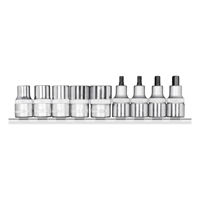 9" (235 mm) long metal holding rail. Socket 1/2, hex, as per DIN 3124, ISO 2725. Screwdriver bit socket 1/2", in-hex, as per DIN 7422. Pressed-in phosphated pin Hand-operated, longitudinal knurled grip. Square drive as per DIN 3120 - C 12.5, ISO 1174, with ball retention groove. Chrome-vanadium steel