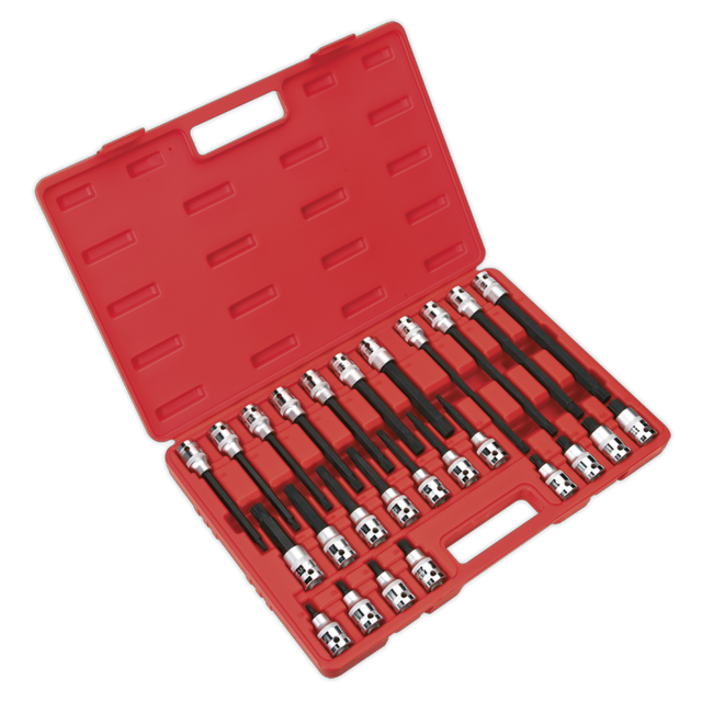 Forged Chrome Vanadium steel sockets with CrV steel spline bits. Sockets heat treated and chrome plated for resistance to corrosion. Fully polished finish with knurled ring to assist gripping with oily fingers. Supplied in storage case.
