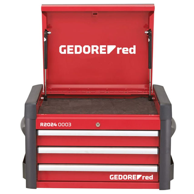 Large carrying handles on either side 3 drawers with telescopic full extension and individual locking device (single-hand operation) Individual locking device on every drawer prevents them from opening when the trolley is in motion, therefore high stability Load capacity 35 kg per drawer Drawer size inside: H 570 x D 410 mm 3 drawers front height 83 mm Drawers with anti-slip mat Generous storage under lid, lid with brake, opening angle 90 degrees, usable as work surface Compartment size: W 520 x D 400 x H 70 mm Central locking with cylinder lock, supplied with two keys Internal shelf dimensions: W 520 x D 400 x H 70 mm Central locking with cylinder lock with 2 keys Can holders on either side Without tools