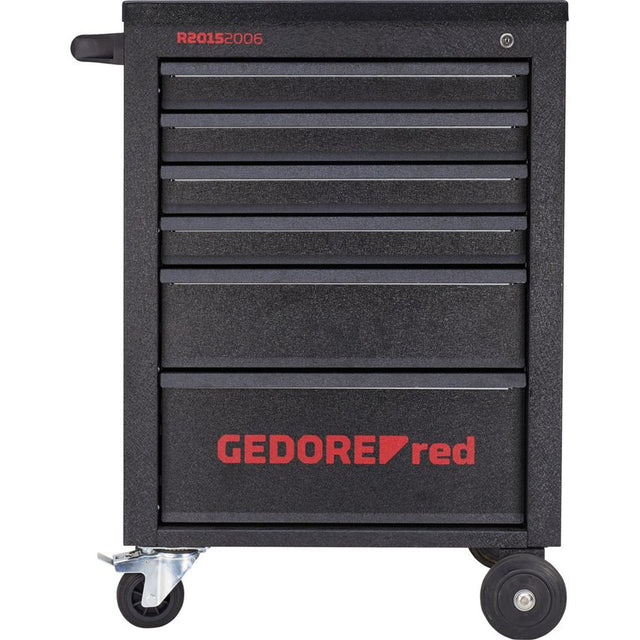 Solid sheet steel construction, torsion-resistant, high load capacity Working platform with ABS top Sides with Euro-standard square perforation for accessories 6 drawers with telescopic fully extending runners, with individual locking (one-hand operation) The individual locking device - unlockable only with a practical, concealed release bar - prevents the drawer being opened when the trolley is in motion Load capacity 25 kg per drawer, variable partitionable Drawer size inside: W 482 x D 345 mm, front height 4x 69 mm, 1x 144 mm, 1x 218 mm Central locking with cylinder lock with 4 keys 2 swivel casters 100 mm of which one has a double-stop wheel lock, 2 castors 125 mm, side projecting thus affording considerable stability