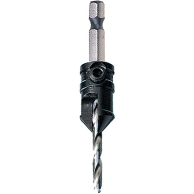 1/4 hex shanks with ball retainer recess for use in quick release bit adaptors or 3-jaw chucks. Heat treated tool steel countersink and HSS drill. Adjustable for different length screws and can produce a counterbored hole for standard size wood plugs. The drill produces pilot holes only.