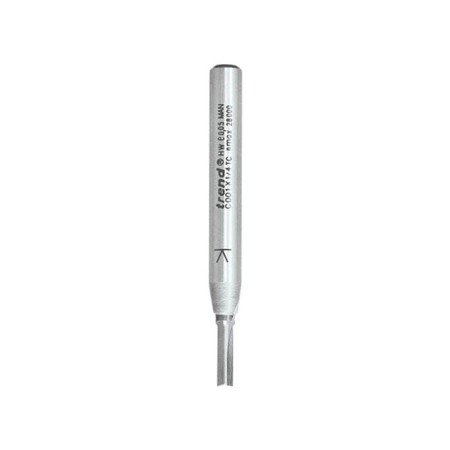 The Trend CraftPro Cutter with two flute carbide TCT tips for cleaner cutting edges and fast clearance of waste in all timber and timber-based materials. With a bottom cut feature. The PTFE coating minimises heat and resin build-up for increased cutter performance and longevity.The 1/4in shank for easy control in smaller routers with 'K' mark shank to ensure safe working practices. Suitable for a wide range of applications such as engraving, grooving, rebating and shallow morticing. Use on softwoods, hardwoods, MDF, plywood and chipboard.