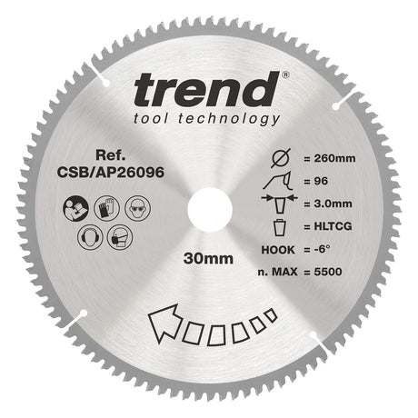 - Aluminium/Plastic Circular Saw Blade 260mm x 30mm x 96T Low stock (10 units)£120.99Unit price /Unavailable