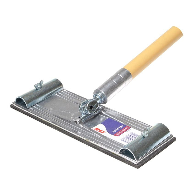 The R.S.T. Pole Sander provides an easy and efficient way of sanding the joints between plasterboards on a ceiling after they have been filled. A swivel head is attached to a wooden pole via a metal thread, and allows easier access into corners. The sander has a soft rubber pad and to keep the the abrasive secured, it has metal clamps. Other poles are available.