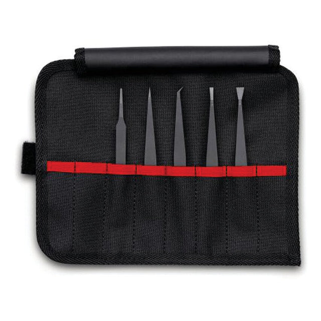 This set contains five high-quality sets of tweezers for various applications. The set contains a set of Precision Tweezers, Universal Tweezers, ESD, Plastic and Insulated Tweezers. All tweezers are manufactured from carbon fibre ESD plastic. Supplied in a tool roll with five compartments. Features and Benefits Optimum combination of tweezers to ensure you have the right set to hand no matter the application Supplied in a tool roll for ease of storage and organisation of your tools Manufactured from carbon fibre plastic for resilience ESD design makes the product safe for electrical use Contents 1 x 92 09 01 ESD - Straight Nose 115 x 2 x 0.3mm Tweezers 1 x 92 09 02 ESD - Needle Nose 115mm Tweezers 1 x 92 09 03 ESD - Bent Nose 110mm Tweezers 1 x 92 09 04 ESD - Straght Nose 115 x 3.3 x 0.12mm Tweezers 1 x 92 09 05 ESD - Straight Nose 115 x 7.7 x 0.12mm Tweezers Typical Applications Electrical Automotive Modelling Standards DIN EN 61340 -5-1