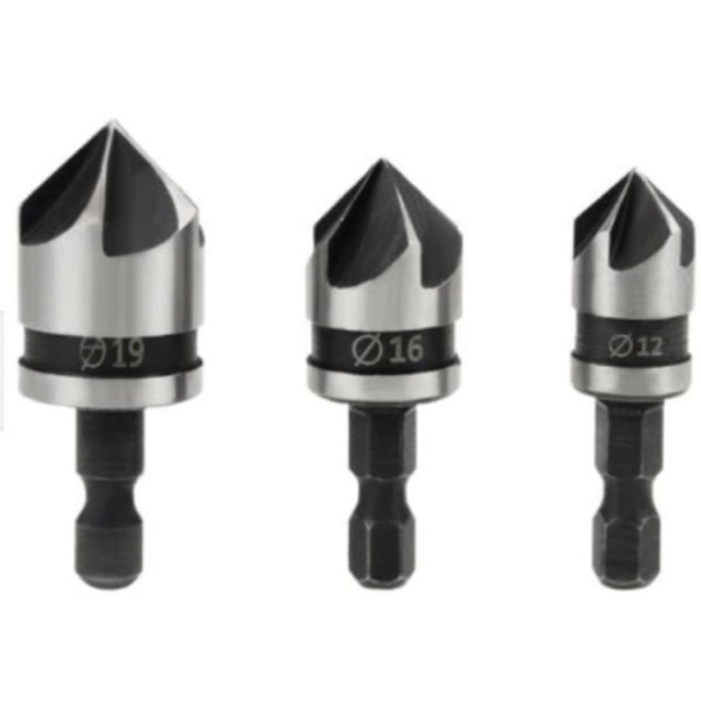 The US PRO 3pc Countersink Set features 5-flute countersinks with a 90 chamfer, designed for precise sinking of holes into soft metals and wood. This set is perfect for preparing countersunk screws and fixings. Key Features: Material: Hardened for durability Application: Suitable for soft metals and wood Specifications: Sizes: 12mm, 16mm, and 19mm Flutes: 5-flute design for efficient cutting Chamfer: 90 angle Shank: 1/4" Hex shank Shank Length: 22mm Lengths: 12mm Countersink: 42mm long 16mm Countersink: 45mm long 19mm Countersink: 48mm long
