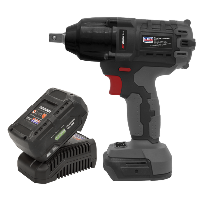 Part of the SV20 Series designed for the professional, offering heavy-duty, high performance, durable tools with lightweight composite designs for superior control and comfort. Powerful, lightweight cordless impact wrench. Durable double injection composite housing with soft grip. Produces torque of up to 700Nm. Brushless motor for improved performance and less maintenance. Variable speed trigger switch for easy control. Forward, reverse and trigger lock. Fitted with electronic brake. Supplied with mains charger, 4Ah battery and a canvas bag.