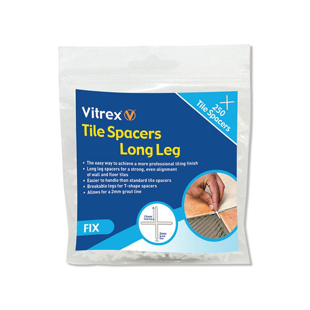These Vitrex Long Leg Spacers provide an easy way to achieve a more professional tiling finish. They ensure a constant and even spacing of tiles, allowing for the specified size in grout line. The tiles spacers have easily breakable legs for T-shape spacers. They are easier to handle than standard tile spacers and allow for a 2mm grout line. Supplied in a resealable bag.