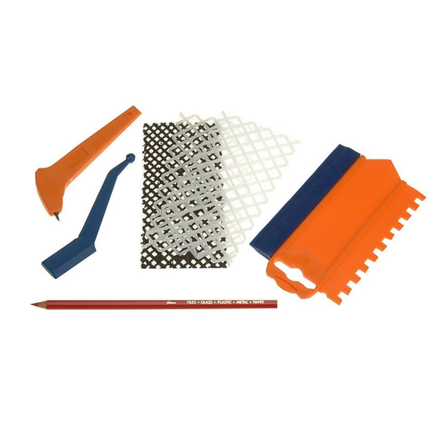 The Vitrex 10 2810 Tiling Starter Kit contains all the basic tools required to cut, fix and grout ceramic tiles. Contents are 1 x Tile Marker. 1 x Tile Scorer. 1 x Tile File. 1 x Combination Spreader/Squeegee. 1 x Grout Finisher. 100 x 1.5mm Tile Spacers.