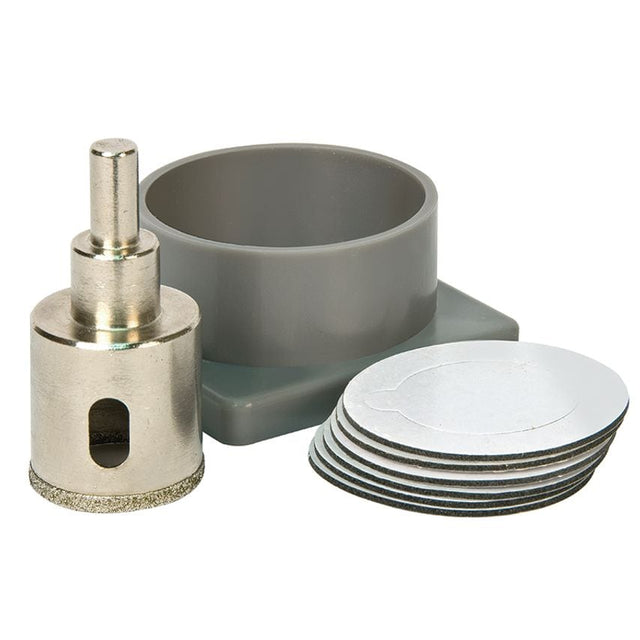 The Vitrex 10 2772 Diamond Tile Drill Bits and Water-Cooling Self Adhesive Kit System offers both the necessary lubrication to extend the life of the drill bit and secure positioning for quick and accurate drilling. This system uses self-adhesive pads for secure positioning and provides the necessary lubrication to extend the life of the drill and cool the drilling surface, includes water delivery and collection cups for clean drilling. Use this system when installing wall fixings through tiles in kitchens and bathrooms. For a wide range of fixtures such as shelves, towel rails or copper pipe. 1 x Drill Guide. 1 x Diamond Drill. 1 x Set of Adhesive Pads. Specification Bit size 35mm.