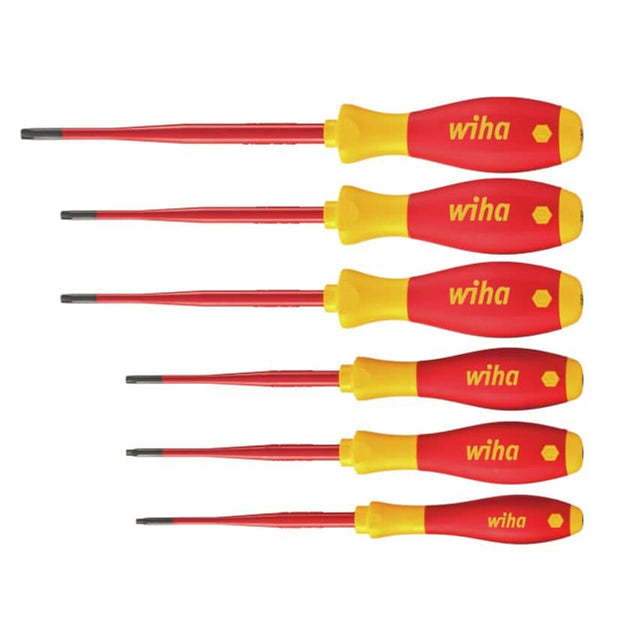 The Wiha SoftFinish electric slimFix Screwdrivers come with a high quality Chrome vanadium steel blade, through hardened with a black-finish. Insulation is moulded directly onto the blade. Individually tested at 10, 000 V AC and approved for 1, 000 V AC. Patented SoftFinish handle ensures work is kind to hands and muscles. Recommended by doctors and therapists at the German Campaign for Healthier Backs. slimFix handles have been specially developed for electric applications, blades are up to 33% slimmer. The unique Wiha handle-length concept provides optimum balance of torque and control. Manufactured according to IEC 60900. This 6 Piece Set contains the following: 6 x Tamper Resistant TORX Screwdrivers: T10 x 100mm, T15 x 100mm, T20 x 100mm, T25 x 125mm, T30 x 125mm &T40 x 150mm.